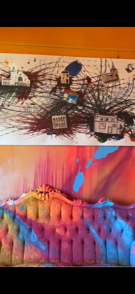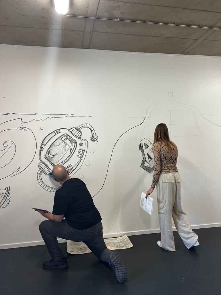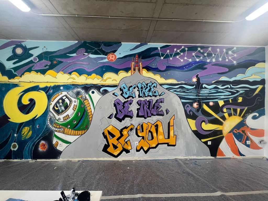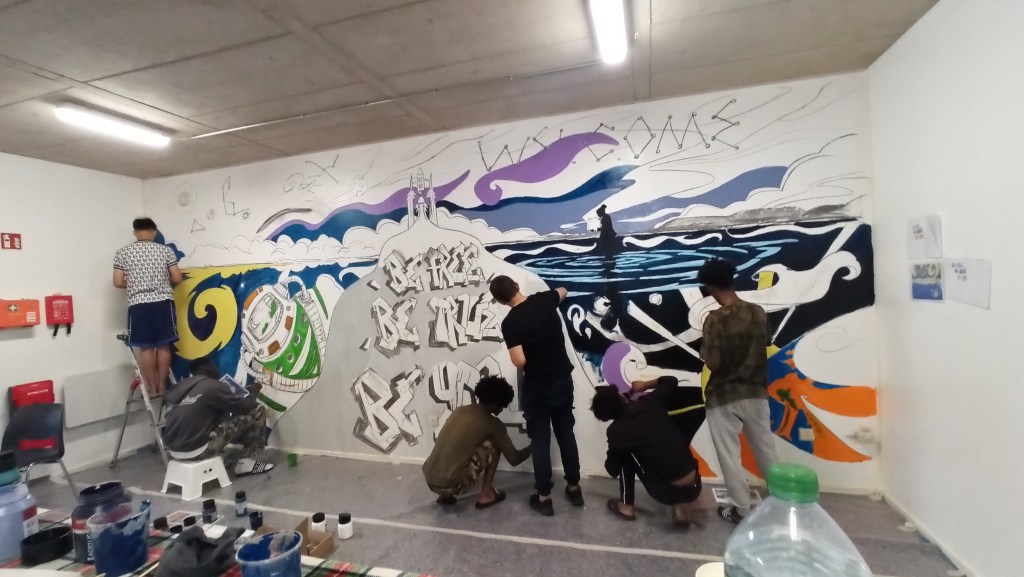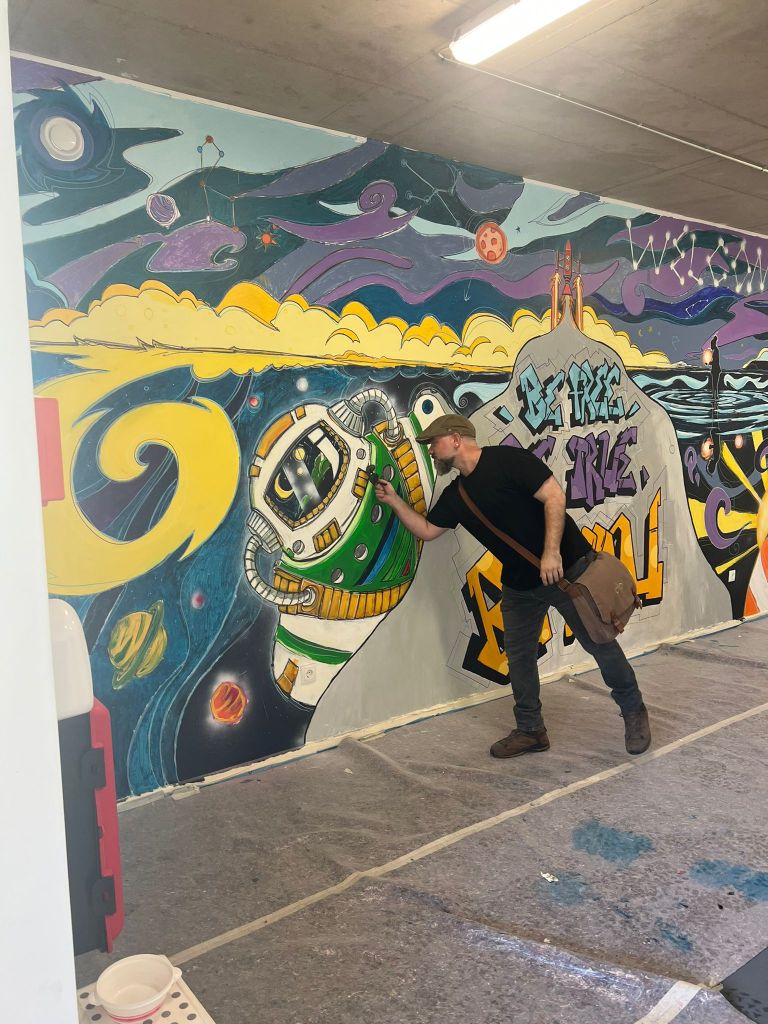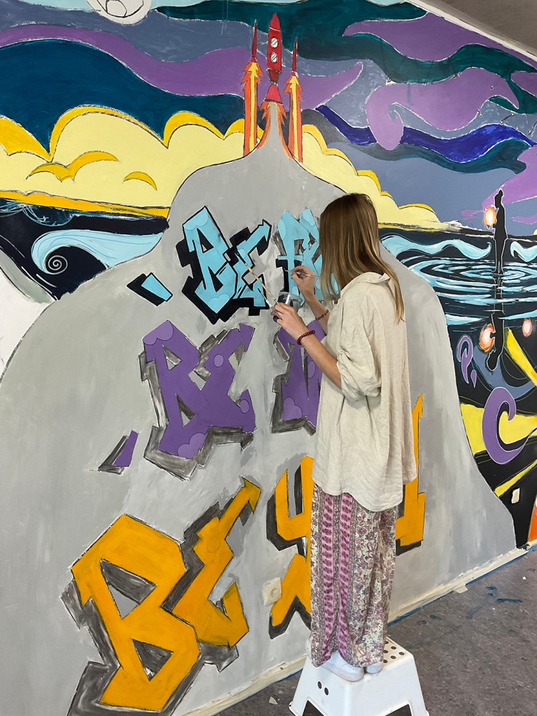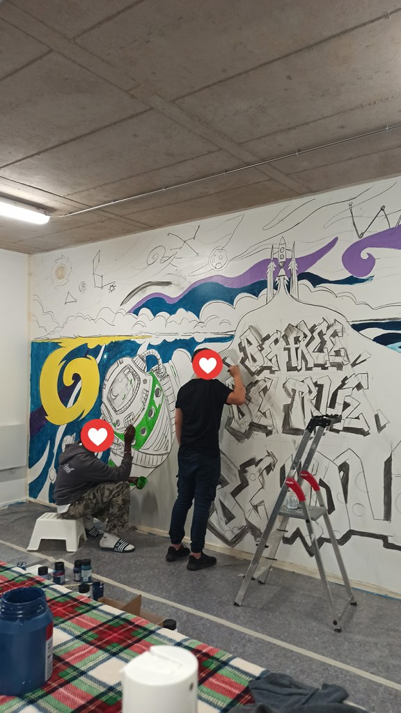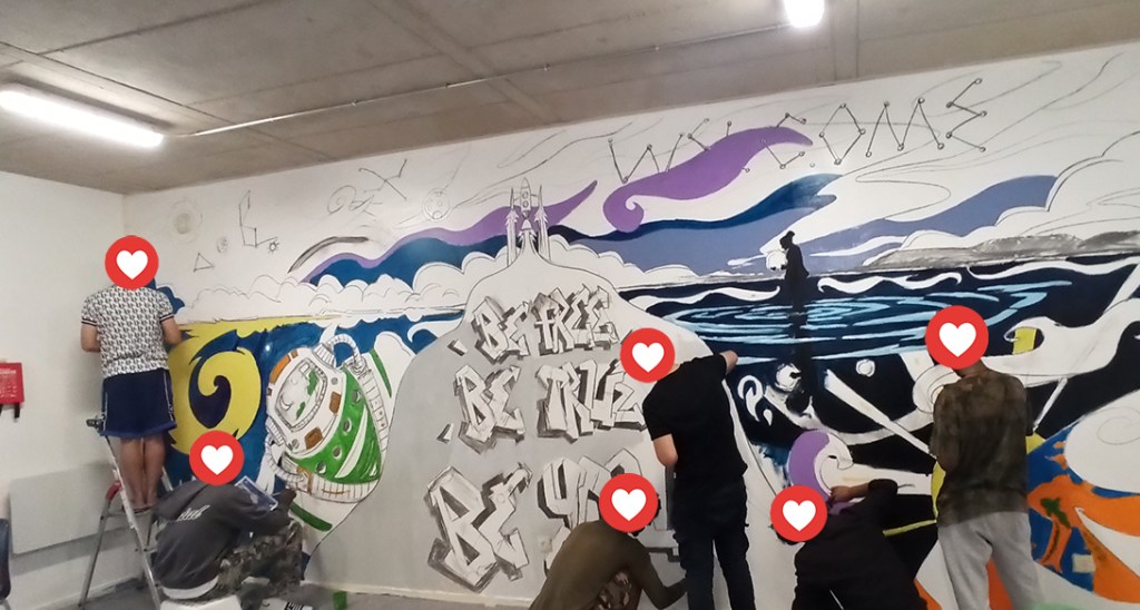 A team of volunteers, extras, and residents from the foyer assisted with the mural painting.