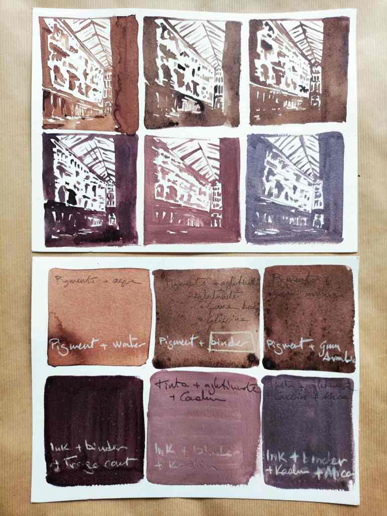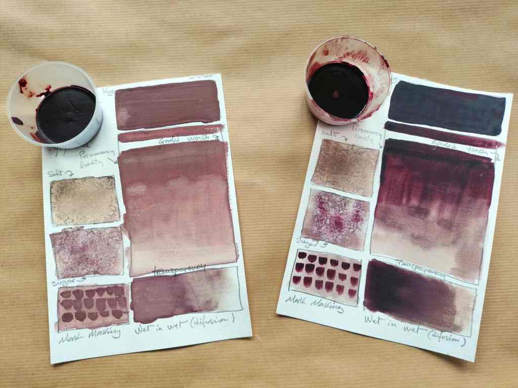 In conclusion, Grenache-Violet Gouache produces intriguing color mixtures, especially when paired with low-tinting colors that allow it to stand out. The resulting effects are influenced by the binder used, which contributes to the gouache’s plasticity. The atmospheric quality of some of the mixtures lends a distinct organic hue that resembles the colors of the atmosphere.